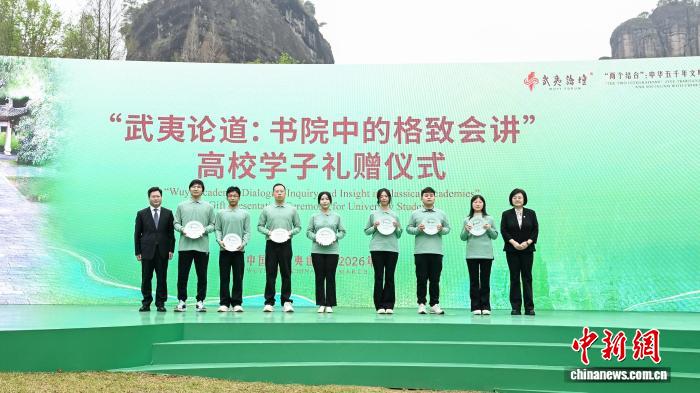 3月22日,第三屆武夷論壇在福建南平武夷山開(kāi)幕。圖為參與論壇配套活動(dòng)“武夷論道:書(shū)院中的格致會(huì)講”高校學(xué)子禮贈(zèng)儀式。 (中國(guó)人民大學(xué)供圖)