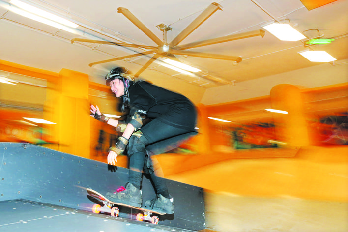 林子祎在北京的一家滑板俱樂部?jī)?nèi)練習(xí)滑板(8月4日攝)。新華社記者 李明 攝