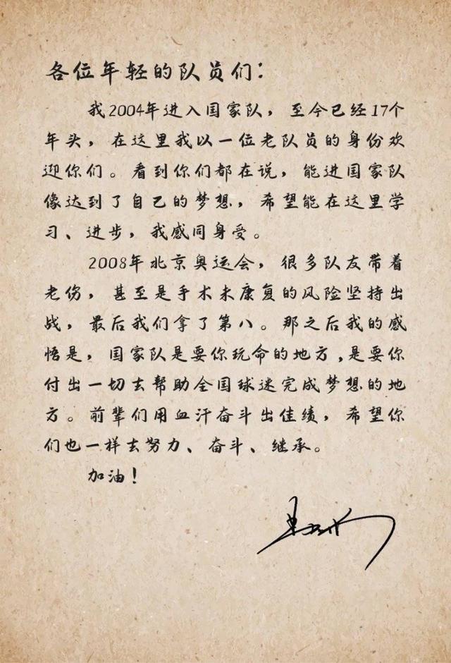 易建聯(lián)在信中回顧了自己首次入選國家隊的感受,表示自己完全能理解新隊員此刻的心情,他尤其強調(diào)了榮譽感與責(zé)任感,對這些小兄弟們說“國家隊是要你玩命的地方”,“各位年輕隊員們,我2004年進入國家隊,至今已經(jīng)有17個年頭,在這里我以一位老隊員的身份歡迎你們。看到你們都在說,能進國家隊像達到了自己的夢想,希望能在這里學(xué)習(xí)、進步,我感同身受。2008年北京奧運會,很多隊友帶著老傷,甚至是手術(shù)未康復(fù)的風(fēng)險堅持出戰(zhàn),最后我們拿到了第八。那之后我的感悟是,國家隊是要你玩命的地方,是要你付出一切去幫助全國球迷完成夢想的地方。前輩們用血汗奮斗出佳績,希望你們也一樣去努力、奮斗、繼承。”