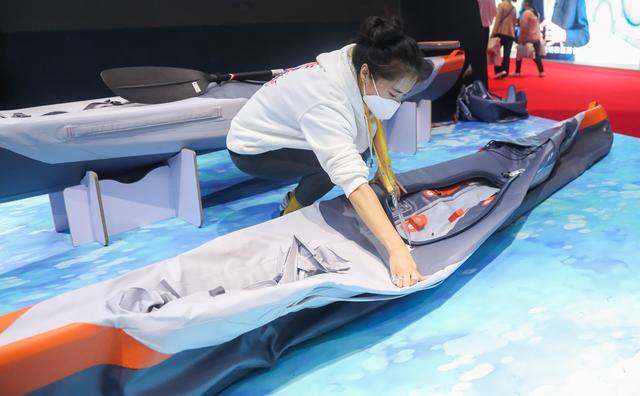 11月6日,工作人員在進(jìn)博會(huì)消費(fèi)品展區(qū)的迪卡儂展臺(tái)演示可折疊皮劃艇如何安裝。新華社記者 丁汀 攝