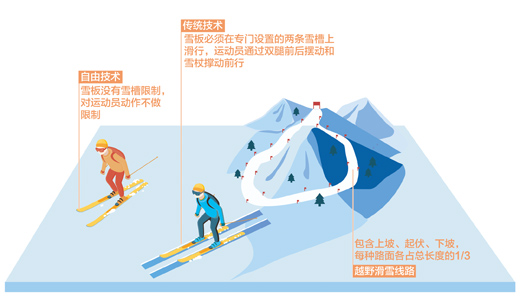 越野滑雪技術(shù)分為傳統(tǒng)技術(shù)和自由技術(shù)。傳統(tǒng)式滑行是在專門設(shè)置的兩條雪槽上進(jìn)行,運(yùn)動員通過雙腿前后擺動和雪杖撐動前行。自由式滑行則沒有雪槽和動作的限制。