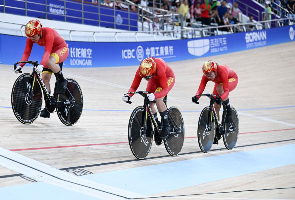 26日傍晚舉行的女子團(tuán)體競速賽決賽中,一道紅色閃電劃破位于千島湖畔的自行車館,激起場內(nèi)一陣陣助威聲。鮑珊菊和隊(duì)友從一開始就占據(jù)領(lǐng)先位置,并最終以46秒376創(chuàng)造新的亞運(yùn)會(huì)紀(jì)錄,將金牌收入囊中。