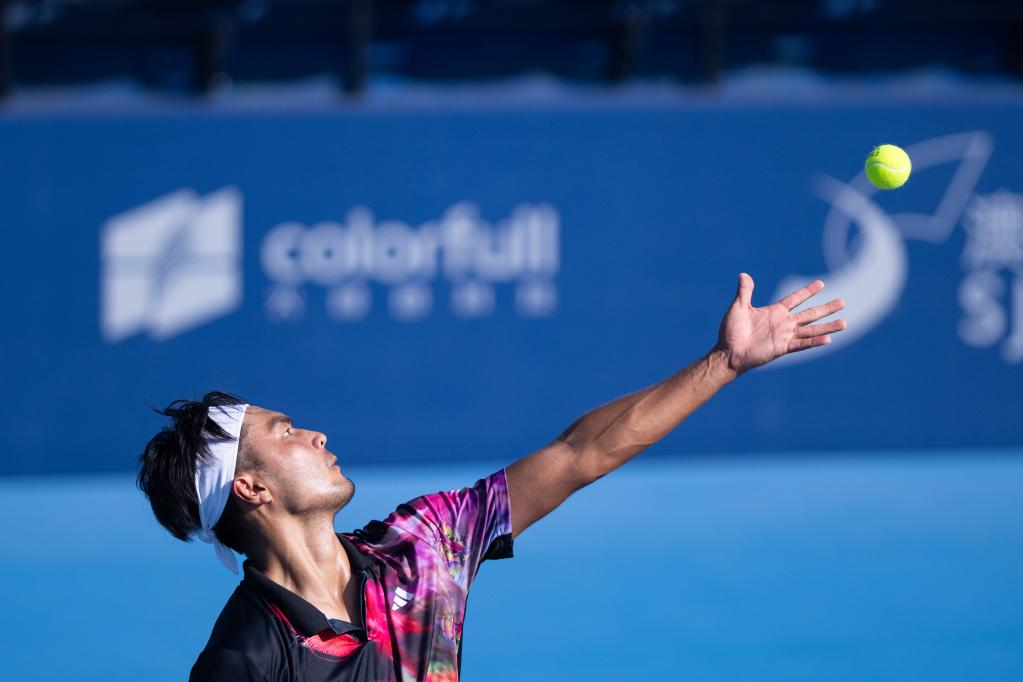 12月10日,特日格樂(lè)在比賽中發(fā)球。新華社記者 張金加 攝