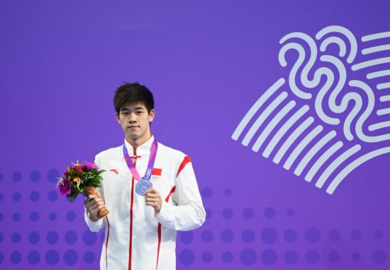 2023年9月27日,亞軍中國選手潘展樂在杭州亞運(yùn)會游泳項(xiàng)目男子200米自由泳的頒獎儀式上。新華社記者 黃宗治 攝
