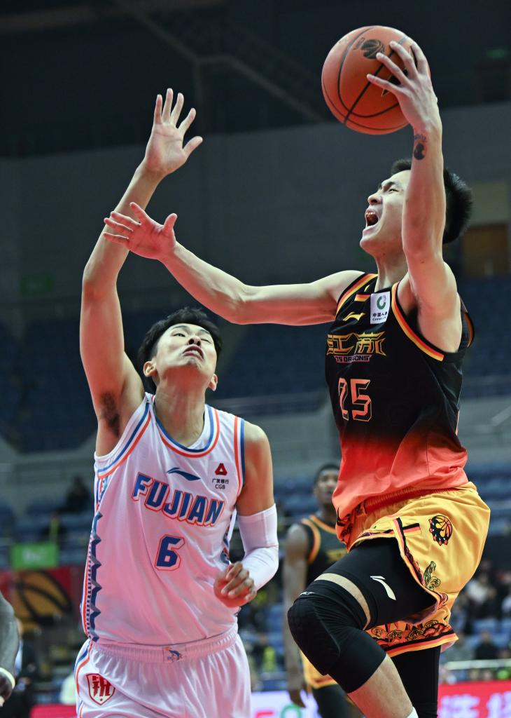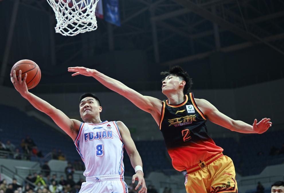 1月4日,福建隊(duì)球員黎伊揚(yáng)(左)在江蘇隊(duì)球員馬建豪的防守下上籃。新華社發(fā)(王須中攝)