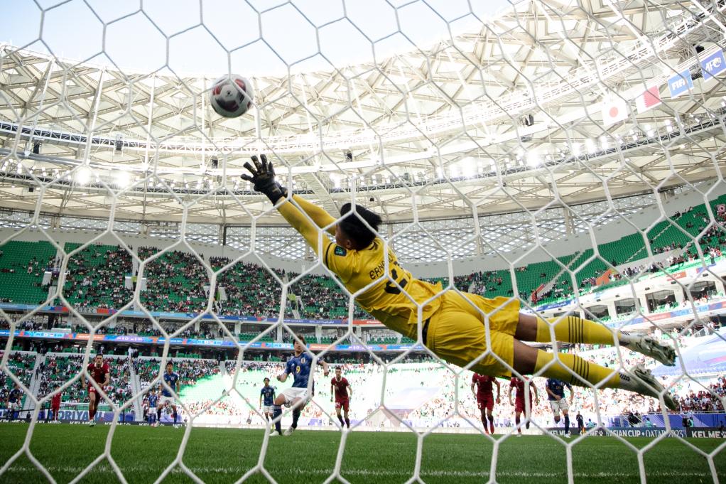 1月24日,印尼隊(duì)守門員埃爾南多·阿里·蘇塔爾亞迪(前)在比賽中未能撲出日本隊(duì)球員上田綺世的點(diǎn)球。新華社記者 江漢 攝