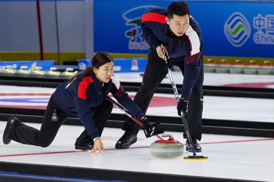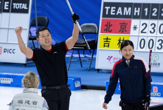 20日,在第十四屆全國(guó)冬季運(yùn)動(dòng)會(huì)冰壺(公開組)混雙決賽中,黑龍江隊(duì)以7:6險(xiǎn)勝福建隊(duì),奪得金牌。