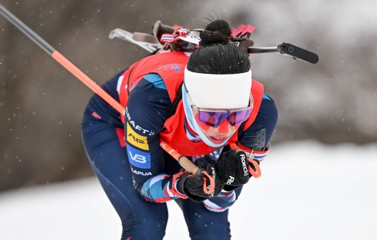 進入第三圈,孟繁棋率先滑完進行立射,但脫靶1次,在150米的“懲罰”賽道上加罰1圈,導致她落后于褚源蒙。最后一輪孟繁棋立射再次脫靶,褚源蒙則在最后兩輪10發(fā)立射全中,最終以領先孟繁棋51秒6的優(yōu)勢率先沖過終點,拿到她在“十四冬”賽場的第三金。孟繁棋獲得銀牌,遼寧隊的楊連紅摘得銅牌。