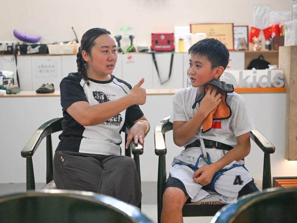 7月16日,方先旻的媽媽在訓(xùn)練間隙鼓勵(lì)孩子。新華社記者 王曦 攝 5歲時(shí) 一次商場(chǎng)攀巖館的邂逅讓方先旻愛上了這項(xiàng)運(yùn)動(dòng) 此后便是日復(fù)一日的堅(jiān)持與付出 累到爆哭也不愿意放棄 每每這時(shí)媽媽都走到一旁不忍心看