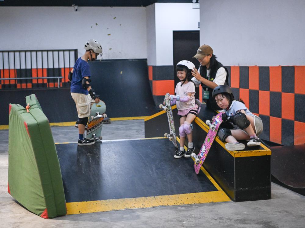 7月17日,閤靈暄(左二)正在進(jìn)行滑板訓(xùn)練。新華社記者 王曦 攝 6歲的閤靈暄就是其中之一 小小的她踩著酷酷的滑板 在訓(xùn)練坡道上不斷上上下下 閤靈暄的父親閤偉峰20多年前就在成都開店賣滑板周邊產(chǎn)品 后來(lái)慢慢開始接觸滑板專業(yè)運(yùn)動(dòng) 組建自己的教練隊(duì)伍 開展專業(yè)滑板訓(xùn)練