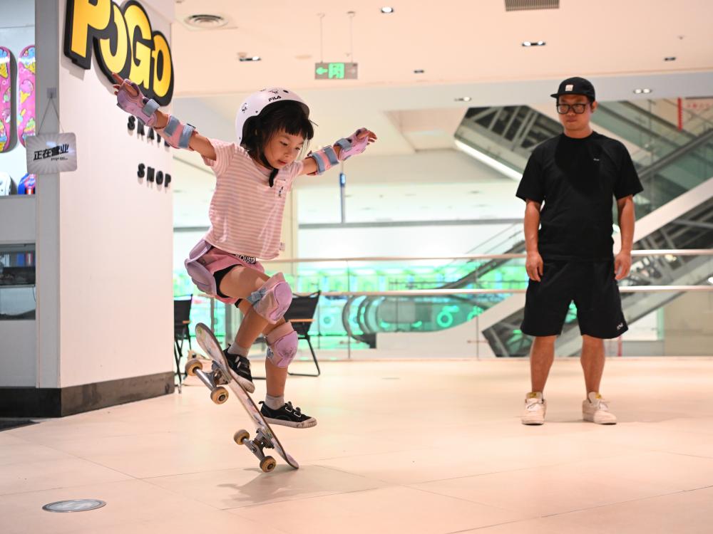7月17日,閤偉峰正在看女兒閤靈暄(左)練習(xí)滑板。新華社記者 王曦 攝 “我接觸滑板三十多年了 這項(xiàng)運(yùn)動(dòng)充滿挑戰(zhàn)與趣味 也讓人更加堅(jiān)韌 這是我希望女兒能從中獲得的珍貴品質(zhì)” 閤偉峰認(rèn)為,滑板項(xiàng)目入奧有利于吸納新群體加入 也讓更多“滑手”能夠獲得更大的成長(zhǎng)空間