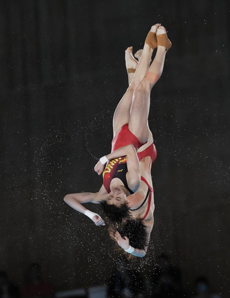7月31日,中國(guó)選手陳芋汐/全紅嬋(前)在比賽中。新華社記者 李穎 攝
