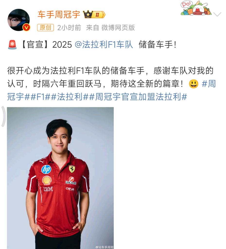 周冠宇通過個人社交平臺表示:“很開心成為法拉利F1車隊(duì)的儲備車手,感謝車隊(duì)對我的認(rèn)可,時隔六年重回‘躍馬’,期待這全新的篇章!”2015年至2018年間,周冠宇曾在法拉利青訓(xùn)學(xué)院度過四年時光。
