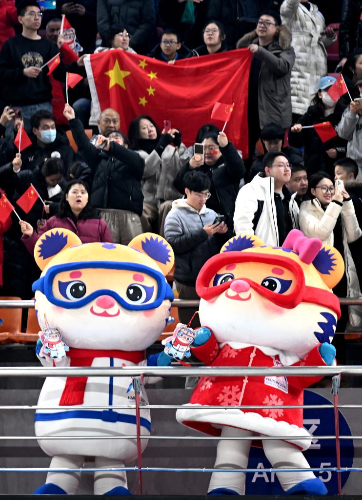 2月12日,吉祥物“濱濱”“妮妮”在比賽間隙打著燈籠,與現(xiàn)場觀眾慶祝元宵節(jié)。新華社記者 李嘉南 攝