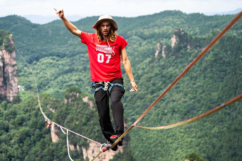 本次高空扁帶賽吸引了來自中國、法國、德國、美國等10個(gè)國家和地區(qū)的20名頂尖扁帶選手參加。扁帶架設(shè)在黃石寨景區(qū)“師徒會”景點(diǎn)和金鞭溪景區(qū)的琵琶峰之間,海拔高度1092米,扁帶架設(shè)總長1600米,是世界目前行走難度系數(shù)極高、地理環(huán)境極為復(fù)雜的高空扁帶。