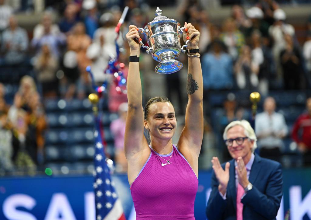 2024年9月7日,薩巴倫卡在頒獎儀式上高舉獎杯。當日,在2024美國網(wǎng)球公開賽女子單打決賽中,白俄羅斯選手薩巴倫卡2比0戰(zhàn)勝美國選手佩古拉,獲得冠軍。新華社記者 李睿 攝