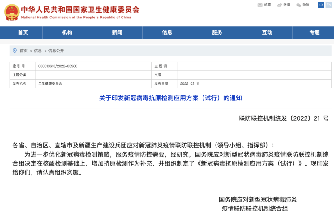 通知指出,為進一步優(yōu)化新冠病毒檢測策略,服務(wù)疫情防控需要,經(jīng)研究,國務(wù)院應(yīng)對新型冠狀病毒肺炎疫情聯(lián)防聯(lián)控機制綜合組決定在核酸檢測基礎(chǔ)上,增加抗原檢測作為補充。