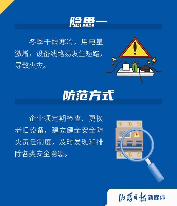 進(jìn)入冬季,氣溫下降,晝夜溫差大,冷暖變化不規(guī)律,一些事故發(fā)生概率會因為季節(jié)性因素而升高,影響企業(yè)的安全生產(chǎn),下面這些隱患需注意。