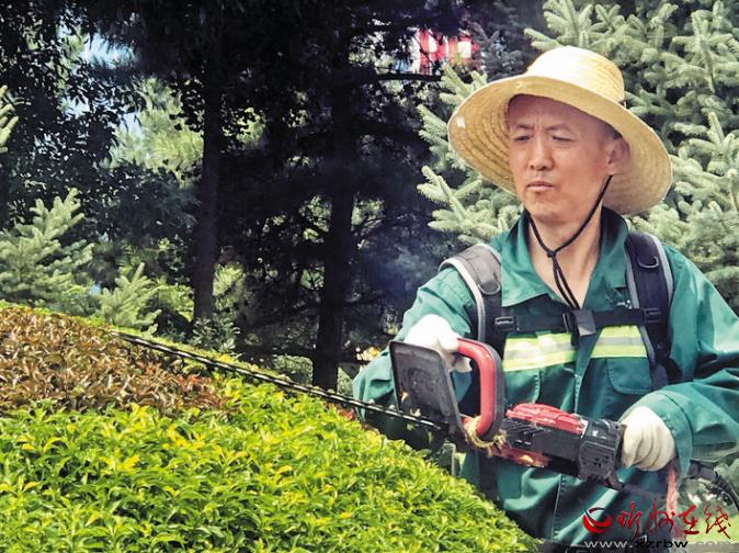 城市是我家,我來扮美它。市園林服務中心體育廣場管理辦公室張立文正在精心修剪綠植。本報記者 范 濤 攝