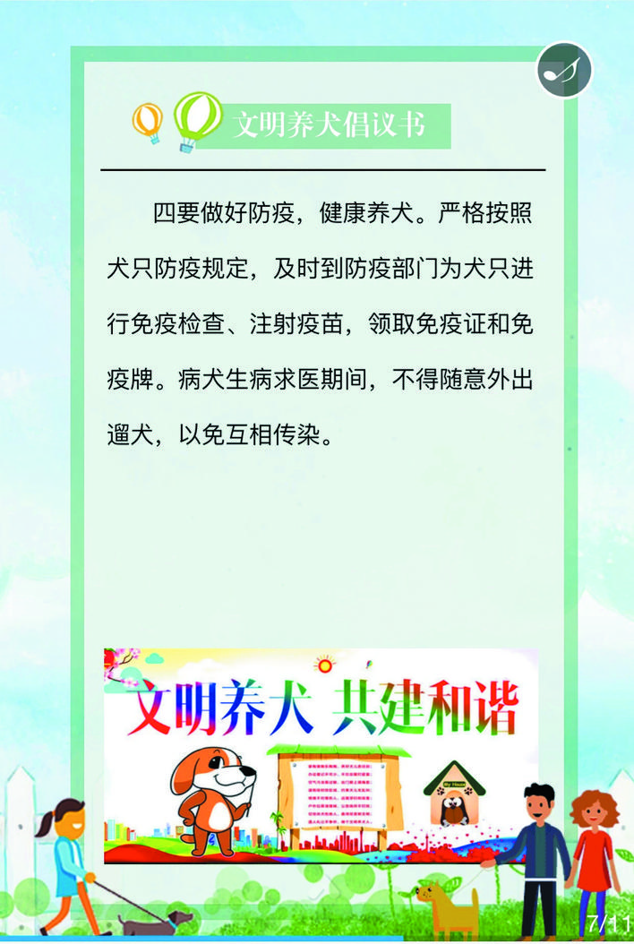 在宣傳活動中,民警深入街道、小區(qū)、商鋪等人員密集場所,在宣傳欄懸掛文明養(yǎng)犬宣傳標語、張貼文明養(yǎng)犬倡議書等宣傳資料,向轄區(qū)居民詳細講解《忻州市養(yǎng)犬管理條例》《文明養(yǎng)犬公告》的具體內(nèi)容,引導(dǎo)養(yǎng)犬群眾主動辦理養(yǎng)犬登記證、出門為犬只佩戴犬牌、定期為犬只注射疫苗,做到依法養(yǎng)犬、文明養(yǎng)犬、衛(wèi)生養(yǎng)犬、健康養(yǎng)犬、安全養(yǎng)犬?;顒又?,該局共懸掛宣傳標語50條,張貼文明養(yǎng)犬倡議書500份,向群眾發(fā)放宣傳資料3500人/份。
