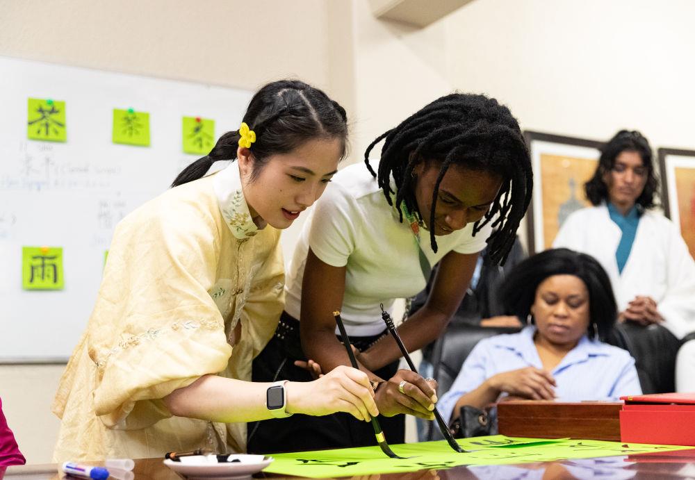△2025年4月17日,在南非約翰內(nèi)斯堡,學(xué)生與孔子學(xué)院志愿者在“國際中文日”活動上寫毛筆字。