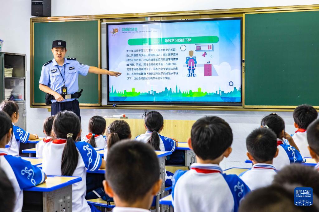 9月11日,貴州省安順市公安局西秀分局民警在安順市第七小學(xué)為學(xué)生講解不良上網(wǎng)習(xí)慣的危害。(新華社發(fā) 陳熙 攝)