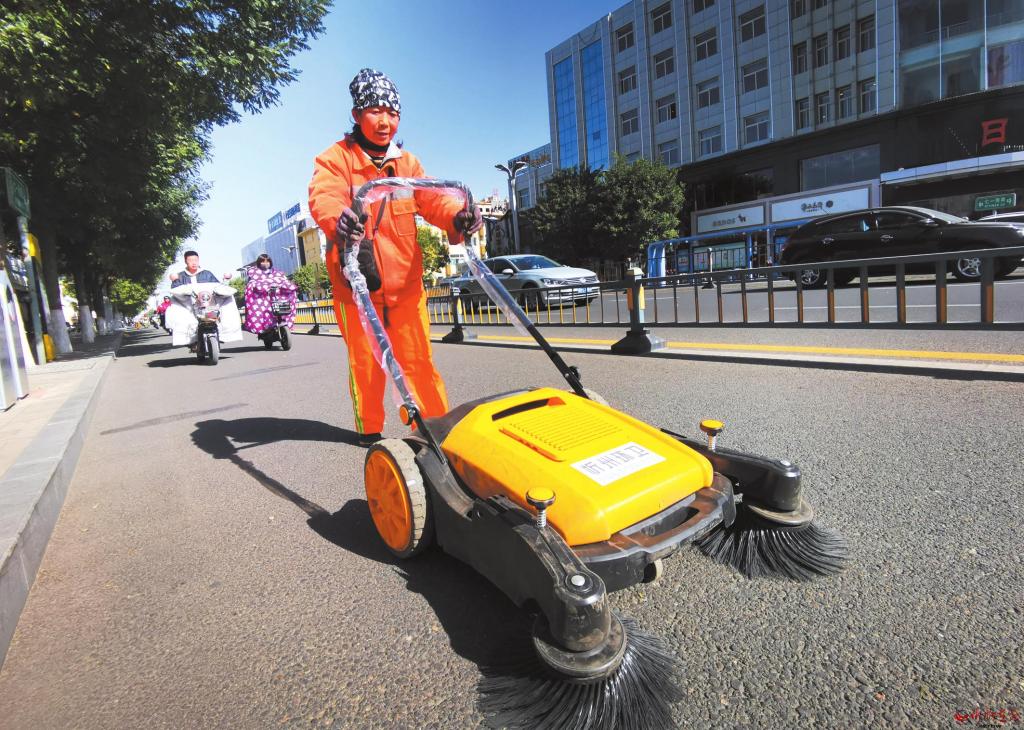 10月21日,環(huán)衛(wèi)工人在城區(qū)七一南路用新配置的無塵手推式掃地機(jī)進(jìn)行清掃作業(yè)。為鞏固提升創(chuàng)文成果,市環(huán)衛(wèi)處狠抓清掃保潔、嚴(yán)控二次污染,多舉措提升衛(wèi)生質(zhì)量,確保市民有良好的工作和生活環(huán)境。 (張存良 攝)