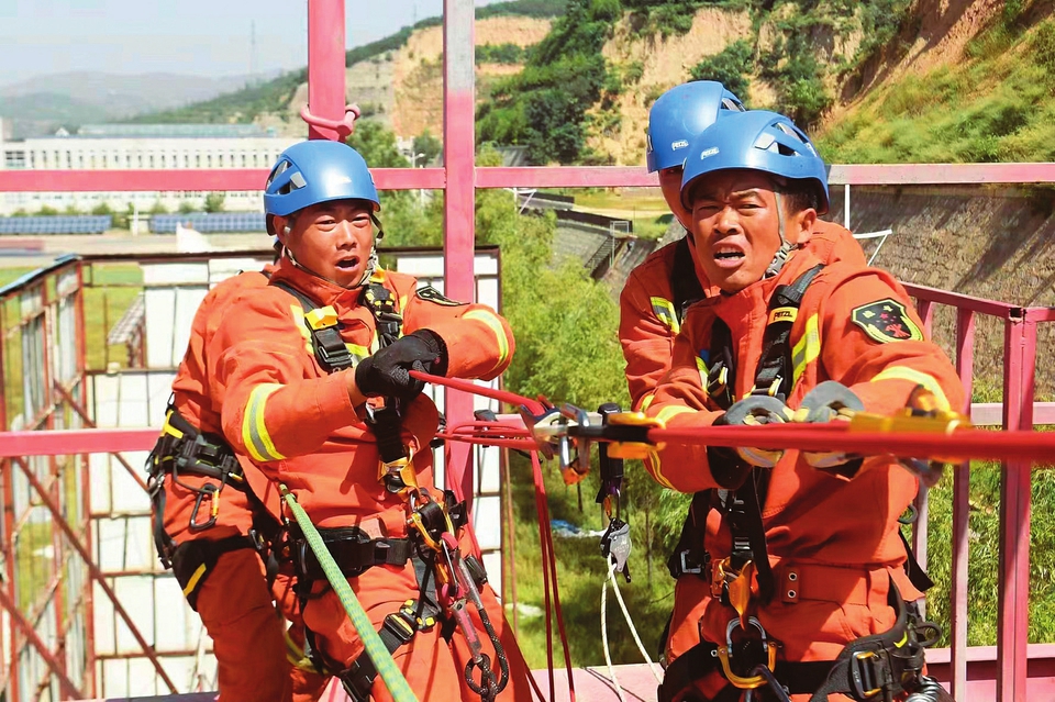 呂梁市消防救援支隊北川河西路特勤站消防員開展繩索救援訓練。張文兵攝