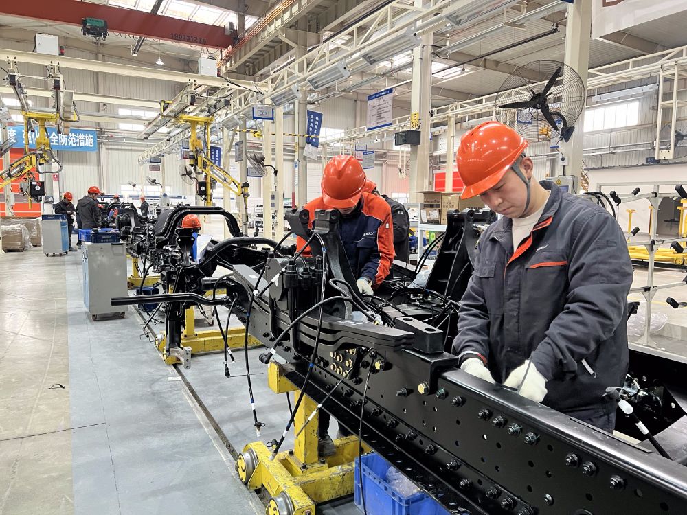 甲醇重卡總裝車間內(nèi)工人們正在進行組裝工作。(新華社記者 張磊 攝)