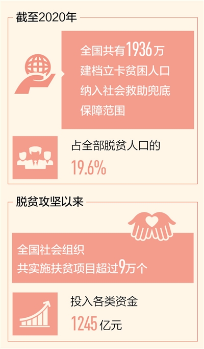 習(xí)近平總書(shū)記指出,民政工作關(guān)系民生、連著民心,是社會(huì)建設(shè)的兜底性、基礎(chǔ)性工作。決戰(zhàn)決勝脫貧攻堅(jiān),民政部門(mén)以完善制度機(jī)制、聚焦特殊群體、助力重點(diǎn)地區(qū)攻堅(jiān)等政策“組合拳”,兜住最困難群體,保住最基本生活。數(shù)據(jù)顯示,截至2020年,全國(guó)共有1936萬(wàn)建檔立卡貧困人口納入社會(huì)救助兜底保障范圍,占全部脫貧人口的19.6%,脫貧地區(qū)群眾獲得感、幸福感、安全感不斷提升。