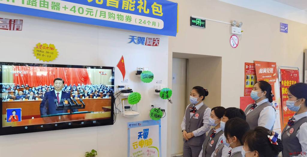 忻州城區(qū)電信七一北路中心營(yíng)業(yè)廳組織職工收看。宮清華 攝
