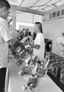 開(kāi)幕式前,提前一兩個(gè)小時(shí)安檢入場(chǎng)的觀眾,遠(yuǎn)遠(yuǎn)就看到“翔翔”的召喚,紛紛在吉祥物專營(yíng)區(qū)扎堆?!?8元一個(gè),就剩30個(gè)了?!睂I(yíng)區(qū)的售賣者告訴山西晚報(bào)記者,他們也沒(méi)想到這只褐馬雞如此受歡迎,很快就要被搶沒(méi)了。大同的趙女士搶到一個(gè),她說(shuō)朋友從外地剛回來(lái)不方便出門,讓她買一個(gè)留作紀(jì)念。