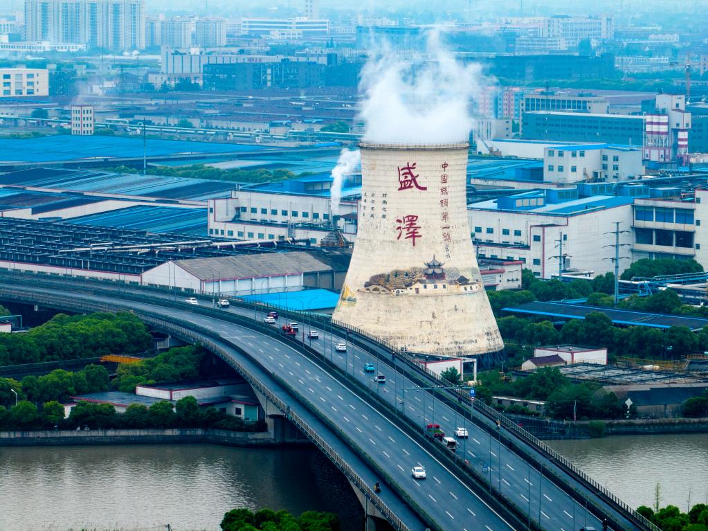 “沒想到一個(gè)小鎮(zhèn)就有‘三環(huán)’,早晚高峰還堵車。喲!這里還是‘中國絲綢第一鎮(zhèn)’?!备S記者一路調(diào)研的司機(jī)師傅說道。順著師傅的示意向窗外眺望,右前方高聳的白色冷卻塔,漸行漸近。塔上“盛澤”二字以及水鄉(xiāng)場景彩繪畫,讓這高55米、底部直徑約48米的冷卻塔,看起來像是一處“文化地標(biāo)”。