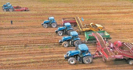 去年秋季,五寨縣現(xiàn)代加工型馬鈴薯種植示范基地里,聯(lián)合收割機(jī)在緊張作業(yè)。 張向榮攝