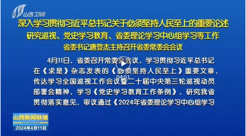 山西日報報道 4月11日,省委召開常委會會議,學(xué)習(xí)貫徹習(xí)近平總書記在《求是》雜志發(fā)表的《必須堅持人民至上》重要文章,傳達(dá)學(xué)習(xí)全國巡視工作會議暨二十屆中央第三輪巡視動員部署會精神,學(xué)習(xí)《黨史學(xué)習(xí)教育工作條例》,研究我省貫徹落實意見,審議通過《2024年省委理論學(xué)習(xí)中心組學(xué)習(xí)計劃》。省委書記唐登杰主持會議。