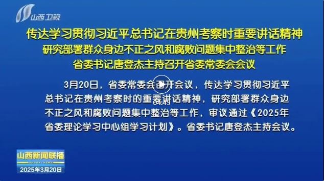 山西日報報道 3月20日,省委常委會召開會議,傳達(dá)學(xué)習(xí)貫徹習(xí)近平總書記在貴州考察時的重要講話精神,研究部署群眾身邊不正之風(fēng)和腐敗問題集中整治等工作,審議通過《2025年省委理論學(xué)習(xí)中心組學(xué)習(xí)計劃》。省委書記唐登杰主持會議。