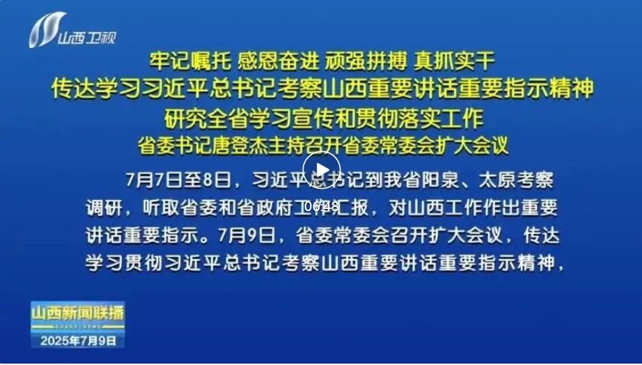 7月7日至8日,習(xí)近平總書(shū)記到我省陽(yáng)泉、太原考察調(diào)研,聽(tīng)取省委和省政府工作匯報(bào),對(duì)山西工作作出重要講話重要指示。7月9日,省委常委會(huì)召開(kāi)擴(kuò)大會(huì)議,傳達(dá)學(xué)習(xí)貫徹習(xí)近平總書(shū)記考察山西重要講話重要指示精神,認(rèn)真落實(shí)黨中央關(guān)于促進(jìn)中部地區(qū)加快崛起、推動(dòng)黃河流域生態(tài)保護(hù)和高質(zhì)量發(fā)展等戰(zhàn)略部署,堅(jiān)持穩(wěn)中求進(jìn)工作總基調(diào),完整準(zhǔn)確全面貫徹新發(fā)展理念,統(tǒng)籌好發(fā)展和安全,努力在推動(dòng)資源型經(jīng)濟(jì)轉(zhuǎn)型發(fā)展上邁出新步伐,奮力譜寫(xiě)三晉大地推進(jìn)中國(guó)式現(xiàn)代化新篇章。省委書(shū)記唐登杰主持會(huì)議。