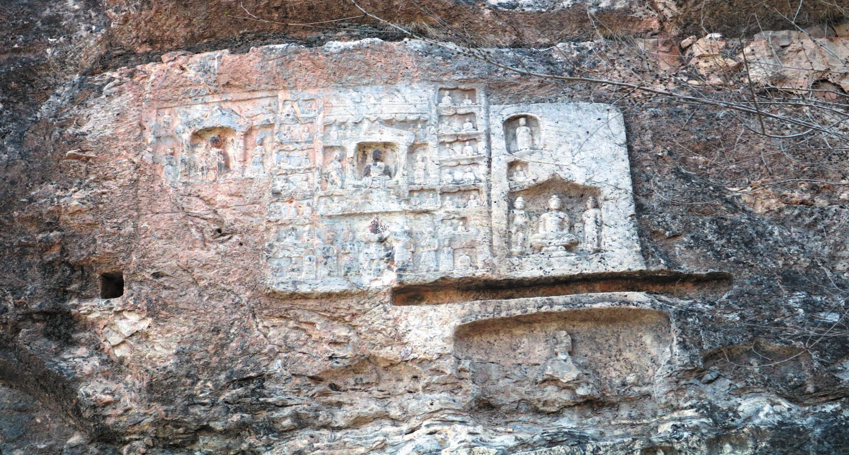 七巖山摩崖造像位于定襄縣南王鄉(xiāng)黃場(chǎng)峪村東南約一千米處,分布于溝兩側(cè)崖壁上?,F(xiàn)存東魏、北齊和唐代摩崖造像及石窟共9處,其中石窟5處,摩崖造像4處,大小佛教造像1200余尊,造像總面積約27平方米。據(jù)《定襄金石考》記載:最早的造像及碑記為北魏神龜二年(519),現(xiàn)無(wú)存。現(xiàn)存最早的摩崖造像及題記為東魏天平三年(536),由僧人慧端等刊刻。另有北齊天保七年(556)廣武令趙郎奴等刊刻的造像及題記,以及唐先天二年(713)造像及題記。石窟主要為佛殿窟和禪窟,造像題材包括七佛、千佛和涅槃像等。