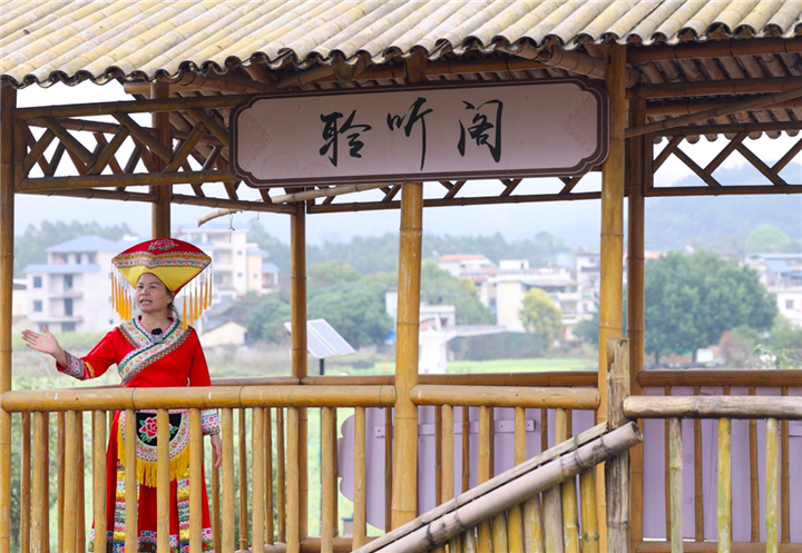 廣西壯族自治區(qū)來(lái)賓市武宣縣三里鎮(zhèn)臺(tái)村村民覃菊艷用歌聲唱出了如今的美好生活
