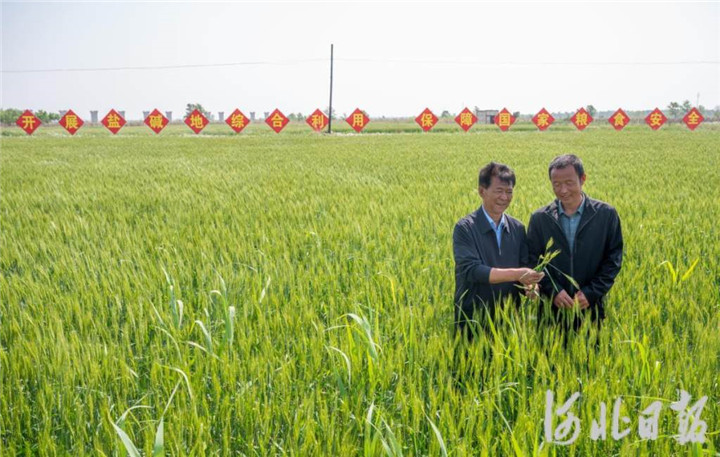 2023年5月,河北省滄州市黃驊市舊城鎮(zhèn)仙莊片區(qū)旱堿地麥田,后仙莊村村民楊東進(jìn)(右)和后仙莊村黨支部副書記劉玉鎖一起查看旱堿麥生長(zhǎng)狀況。 河北日?qǐng)?bào)記者 趙杰 攝