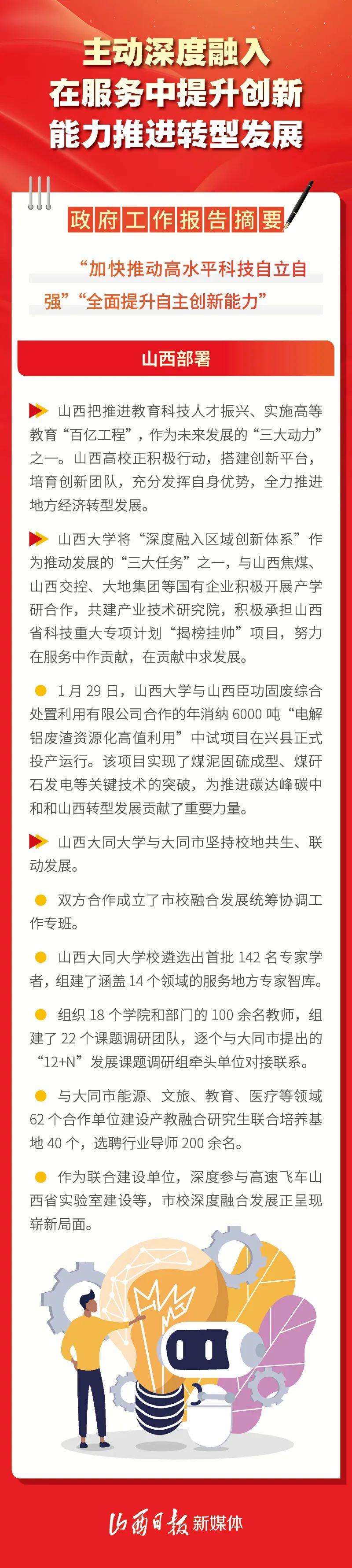 今年政府工作報告指出,堅持教育強國、科技強國、人才強國建設一體統(tǒng)籌推進,創(chuàng)新鏈產(chǎn)業(yè)鏈資金鏈人才鏈一體部署實施。這為山西高校更好地服務全省各地轉(zhuǎn)型發(fā)展、高質(zhì)量發(fā)展提供了遵循。