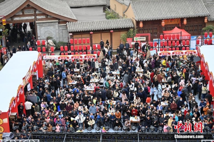 在甘肅天水古城舉行的麻辣燙“吃貨節(jié)”現(xiàn)場(chǎng),八方游客品嘗麻辣燙。九美旦增 攝