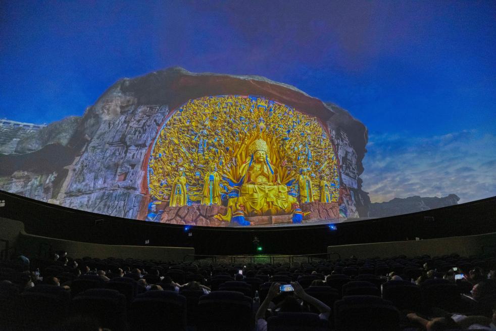 觀眾在大足石刻游客中心觀看球幕電影。(大足石刻研究院供圖)