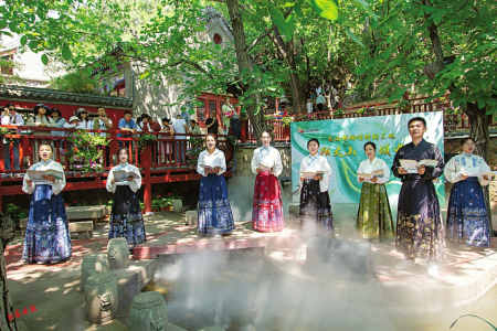 在太山景區(qū)售票廳里,背誦古詩詞免門票的活動吸引了不少18周歲以下的學(xué)生參加,大家通過轉(zhuǎn)盤選定需要背誦的古詩詞,完成背誦即可獲得門票一張?!昂屯瑢W(xué)們正好一塊兒來了,通過參加這個活動,弘揚我們的傳統(tǒng)文化,是非常有意義的?!苯衲晔钇?,太山景區(qū)面向廣大學(xué)生推出皮影戲、手工DIY印章、拓印等非遺體驗活動。同時,景區(qū)還準(zhǔn)備了2000多套漢服,免費為游客提供。