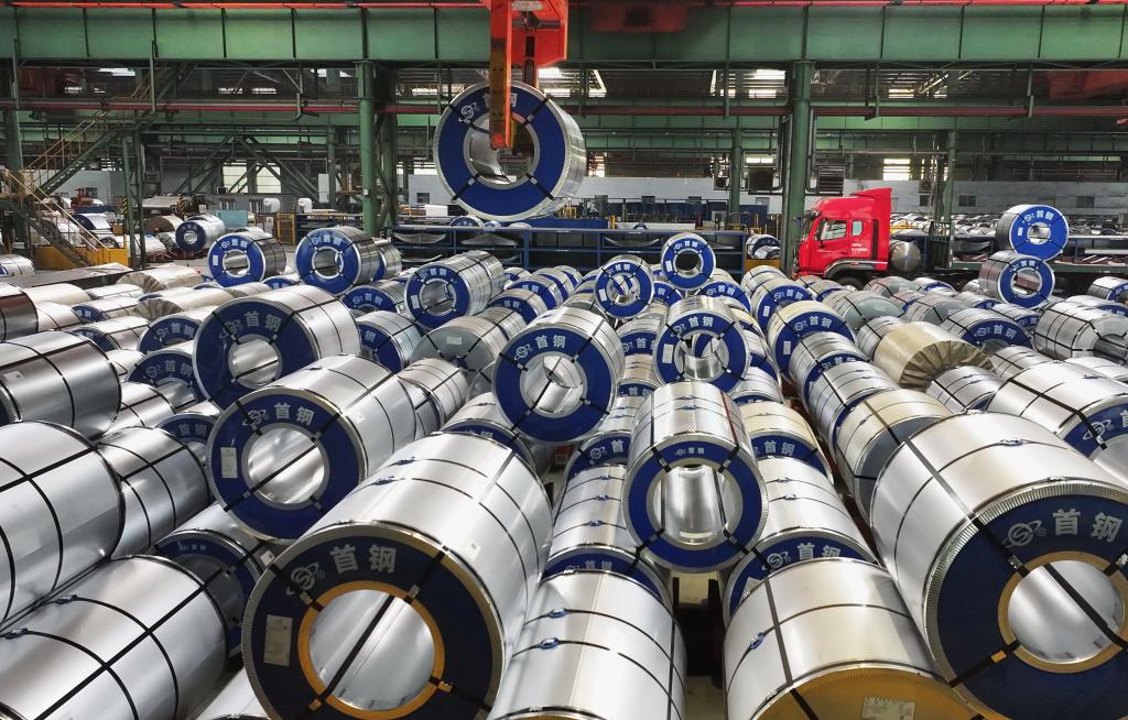首鋼京唐公司成品車間的吊裝設(shè)備在吊運(yùn)鋼板(無(wú)人機(jī)照片)。新華社記者 楊世堯 攝