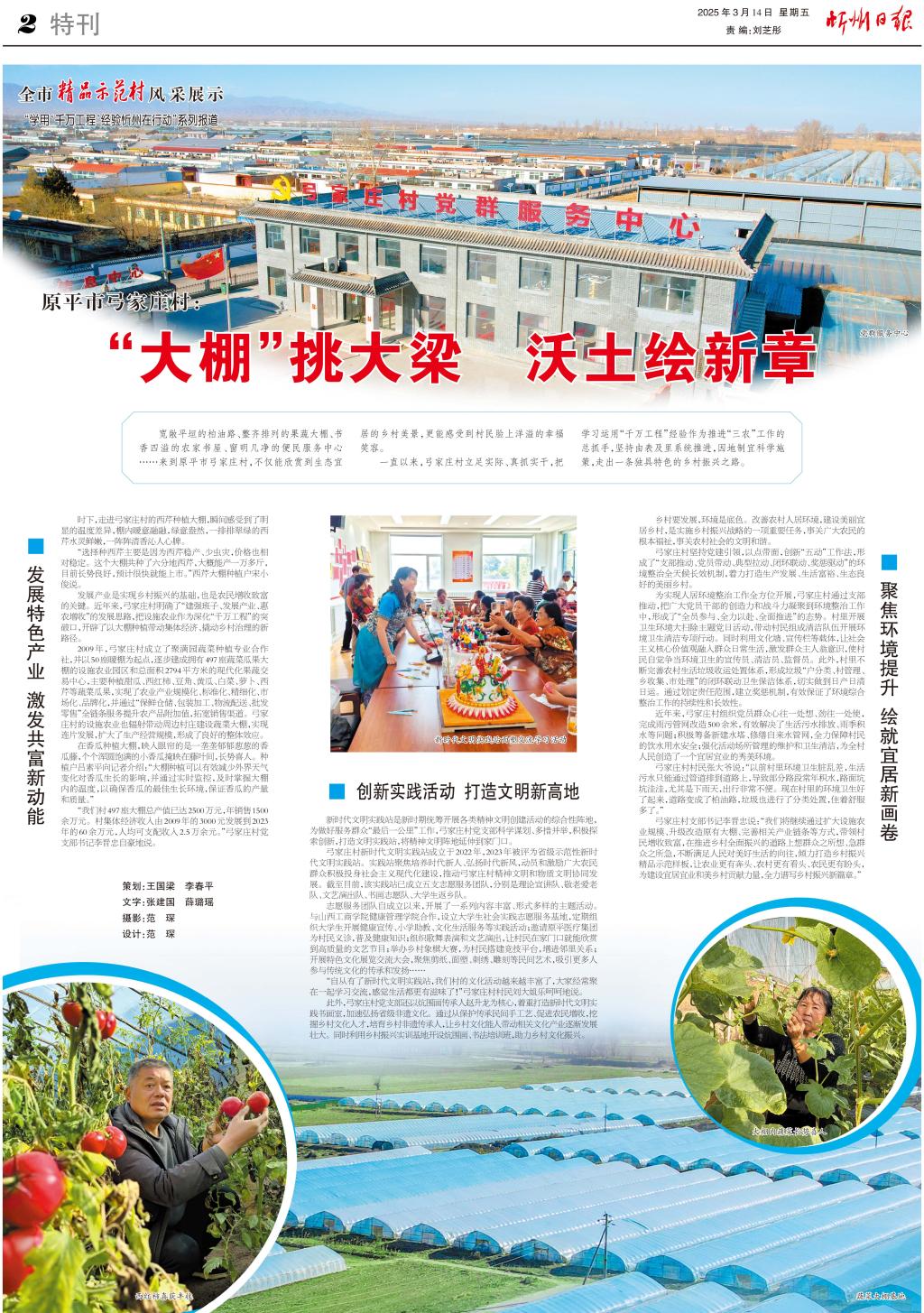 寬敞平坦的柏油路、整齊排列的果蔬大棚、書香四溢的農(nóng)家書屋、窗明幾凈的便民服務(wù)中心……來到原平市弓家莊村,不僅能欣賞到生態(tài)宜居的鄉(xiāng)村美景,更能感受到村民臉上洋溢的幸福笑容。 一直以來,弓家莊村立足實(shí)際、真抓實(shí)干,把學(xué)習(xí)運(yùn)用“千萬工程”經(jīng)驗(yàn)作為推進(jìn)“三農(nóng)”工作的總抓手,堅(jiān)持由表及里系統(tǒng)推進(jìn),因地制宜科學(xué)施策,走出一條獨(dú)具特色的鄉(xiāng)村振興之路。 ■ 發(fā)展特色產(chǎn)業(yè) 激發(fā)共富新動(dòng)能 時(shí)下,走進(jìn)弓家莊村的西芹種植大棚,瞬間感受到了明顯的溫度差異,棚內(nèi)暖意融融,綠意盎然,一排排翠綠的西芹水靈鮮嫩,一陣陣清香沁人心脾。 “選擇種西芹主要是因?yàn)槲髑鄯€(wěn)產(chǎn)、少蟲災(zāi),價(jià)格也相對穩(wěn)定。這個(gè)大棚共種了六分地西芹,大概能產(chǎn)一萬多斤,目前長勢良好,預(yù)計(jì)很快就能上市?!蔽髑鄞笈锓N植戶宋小俊說。 發(fā)展產(chǎn)業(yè)是實(shí)現(xiàn)鄉(xiāng)村振興的基礎(chǔ),也是農(nóng)民增收致富的關(guān)鍵。近年來,弓家莊村明確了“建強(qiáng)班子、發(fā)展產(chǎn)業(yè)、惠農(nóng)增收”的發(fā)展思路,把設(shè)施農(nóng)業(yè)作為深化“千萬工程”的突破口,開辟了以大棚種植帶動(dòng)集體經(jīng)濟(jì)、撬動(dòng)鄉(xiāng)村治理的新路徑。 2009年,弓家莊村成立了聚滿園蔬菜種植專業(yè)合作社,并以50座暖棚為起點(diǎn),逐步建成擁有497座蔬菜瓜果大棚的設(shè)施農(nóng)業(yè)園區(qū)和總面積2794平方米的現(xiàn)代化果蔬交易中心,主要種植甜瓜、西紅柿、豆角、黃瓜、白菜、蘿卜、西芹等蔬菜瓜果,實(shí)現(xiàn)了農(nóng)業(yè)產(chǎn)業(yè)規(guī)?;?、標(biāo)準(zhǔn)化、精細(xì)化、市場化、品牌化,并通過“保鮮倉儲、包裝加工、物流配送、批發(fā)零售”全鏈條服務(wù)提升農(nóng)產(chǎn)品附加值,拓寬銷售渠道。弓家莊村的設(shè)施農(nóng)業(yè)也輻射帶動(dòng)周邊村莊建設(shè)蔬菜大棚,實(shí)現(xiàn)連片發(fā)展,擴(kuò)大了生產(chǎn)經(jīng)營規(guī)模,形成了良好的整體效應(yīng)。 在香瓜種植大棚,映入眼簾的是一壟壟郁郁蔥蔥的香瓜藤,個(gè)個(gè)渾圓飽滿的小香瓜掩映在藤葉間,長勢喜人。種植戶呂素平向記者介紹:“大棚種植可以有效減少外界天氣變化對香瓜生長的影響,并通過實(shí)時(shí)監(jiān)控,及時(shí)掌握大棚內(nèi)的溫度,以確保香瓜的最佳生長環(huán)境,保證香瓜的產(chǎn)量和質(zhì)量?!?/p> “我們村497座大棚總產(chǎn)值已達(dá)2500萬元,年銷售1500余萬元。村集體經(jīng)濟(jì)收入由2009年的3000元發(fā)展到2023年的60余萬元,人均可支配收入2.5萬余元?!惫仪f村黨支部書記李晉忠自豪地說。 ■ 創(chuàng)新實(shí)踐活動(dòng) 打造文明新高地 新時(shí)代文明實(shí)踐站是新時(shí)期統(tǒng)籌開展各類精神文明創(chuàng)建活動(dòng)的綜合性陣地,為做好服務(wù)群眾“最后一公里”工作,弓家莊村黨支部科學(xué)謀劃、多措并舉,積極探索創(chuàng)新,打造文明實(shí)踐站,將精神文明陣地延伸到家門口。 弓家莊村新時(shí)代文明實(shí)踐站成立于2022年,2023年被評為省級示范性新時(shí)代文明實(shí)踐站。實(shí)踐站聚焦培養(yǎng)時(shí)代新人、弘揚(yáng)時(shí)代新風(fēng),動(dòng)員和激勵(lì)廣大農(nóng)民群眾積極投身社會主義現(xiàn)代化建設(shè),推動(dòng)弓家莊村精神文明和物質(zhì)文明協(xié)同發(fā)展。截至目前,該實(shí)踐站已成立五支志愿服務(wù)團(tuán)隊(duì),分別是理論宣講隊(duì)、敬老愛老隊(duì)、文藝演出隊(duì)、書畫志愿隊(duì)、大學(xué)生返鄉(xiāng)隊(duì)。 志愿服務(wù)團(tuán)隊(duì)自成立以來,開展了一系列內(nèi)容豐富、形式多樣的主題活動(dòng)。與山西工商學(xué)院健康管理學(xué)院合作,設(shè)立大學(xué)生社會實(shí)踐志愿服務(wù)基地,定期組織大學(xué)生開展健康宣傳、小學(xué)助教、文化生活服務(wù)等實(shí)踐活動(dòng);邀請?jiān)结t(yī)療集團(tuán)為村民義診,普及健康知識;組織歌舞表演和文藝演出,讓村民在家門口就能欣賞到高質(zhì)量的文藝節(jié)目;舉辦鄉(xiāng)村象棋大賽,為村民搭建競技平臺,增進(jìn)鄰里關(guān)系;開展特色文化展覽交流大會,聚焦剪紙、面塑、刺繡、雕刻等民間藝術(shù),吸引更多人參與傳統(tǒng)文化的傳承和發(fā)揚(yáng)…… “自從有了新時(shí)代文明實(shí)踐站,我們村的文化活動(dòng)越來越豐富了,大家經(jīng)常聚在一起學(xué)習(xí)交流,感覺生活都更有滋味了!”弓家莊村村民劉大姐樂呵呵地說。 此外,弓家莊村黨支部還以炕圍畫傳承人趙升龍為核心,著重打造新時(shí)代文明實(shí)踐書畫室,加速弘揚(yáng)省級非遺文化。通過從保護(hù)傳承民間手工藝、促進(jìn)農(nóng)民增收,挖掘鄉(xiāng)村文化人才,培育鄉(xiāng)村非遺傳承人,讓鄉(xiāng)村文化能人帶動(dòng)相關(guān)文化產(chǎn)業(yè)逐漸發(fā)展壯大。同時(shí)利用鄉(xiāng)村振興實(shí)訓(xùn)基地開設(shè)炕圍畫、書法培訓(xùn)班,助力鄉(xiāng)村文化振興。 ■ 聚焦環(huán)境提升 繪就宜居新畫卷 鄉(xiāng)村要發(fā)展,環(huán)境是底色。改