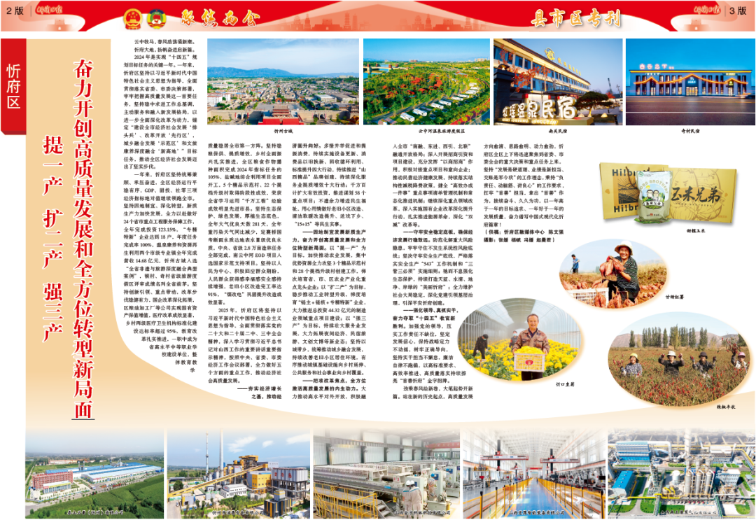 一年來,忻府區(qū)堅持統(tǒng)籌兼顧、承壓奮進(jìn),全區(qū)經(jīng)濟(jì)運行平穩(wěn)有序,GDP、固投、社零三項經(jīng)濟(jì)指標(biāo)絕對值繼續(xù)領(lǐng)跑全市。堅持因地制宜、深化轉(zhuǎn)型,新質(zhì)生產(chǎn)力加快發(fā)展,全力以赴做好24個省市重點工程服務(wù)保障工作,全年完成投資123.15%,“專精特新”企業(yè)達(dá)到18戶,年度任務(wù)完成率100%,溫泉康養(yǎng)和資源再生利用兩個市級專業(yè)鎮(zhèn)全年完成營收14.68億元,忻州古城入選“全省非遺與旅游深度融合典型案例”,頓村、奇村省級旅游度假區(qū)評審成績名列全省前茅。堅持創(chuàng)新引領(lǐng)、重點帶動,改革步伐穩(wěn)健有力,國企改革深化拓展,區(qū)糧油加工廠等公司實現(xiàn)國有資產(chǎn)保值增值,醫(yī)療改革成效顯著,鄉(xiāng)村兩級醫(yī)療衛(wèi)生機(jī)構(gòu)標(biāo)準(zhǔn)化建設(shè)達(dá)標(biāo)率超過95%,教育改革扎實推進(jìn),一職中成為省高水平中等職業(yè)學(xué)校建設(shè)單位,整體教育教學(xué)質(zhì)量穩(wěn)居全市第一方陣。堅持穩(wěn)糧保供、提質(zhì)增效,鄉(xiāng)村全面振興扎實推進(jìn),全區(qū)糧食作物播種面積完成2024年指標(biāo)任務(wù)的105%,鹽堿地綜合利用項目全面開工,5個精品示范村、22個提檔升級村取得階段性成效,榮獲全省學(xué)習(xí)運用“千萬工程”經(jīng)驗成效明顯先進(jìn)市縣。堅持生態(tài)保護(hù)、綠色發(fā)展,厚植生態(tài)底色,全年大氣優(yōu)良天數(shù)281天,全年重污染天氣同比減少,定襄橋國考斷面水質(zhì)達(dá)地表水Ⅲ級優(yōu)良水質(zhì),中央、省級2.8萬畝造林任務(wù)全部完成,南云中河EOD項目入選國家示范支持項目。堅持以人民為中心、積極回應(yīng)群眾期盼,人民群眾獲得感幸福感安全感持續(xù)增強(qiáng),老舊小區(qū)改造完工率達(dá)91%,“煤改電”鞏固提升改造成效顯著。
