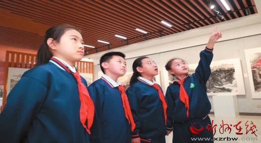 沿著“心靈之塔”臺階緩步而上,學(xué)生們駐足細(xì)讀,指尖摩挲著書中的文字,如同觸摸智慧的密碼。轉(zhuǎn)入書畫展廳,一幅幅水墨長卷鋪展開來,學(xué)生們與千年山水完成了一場跨越時空的對話。